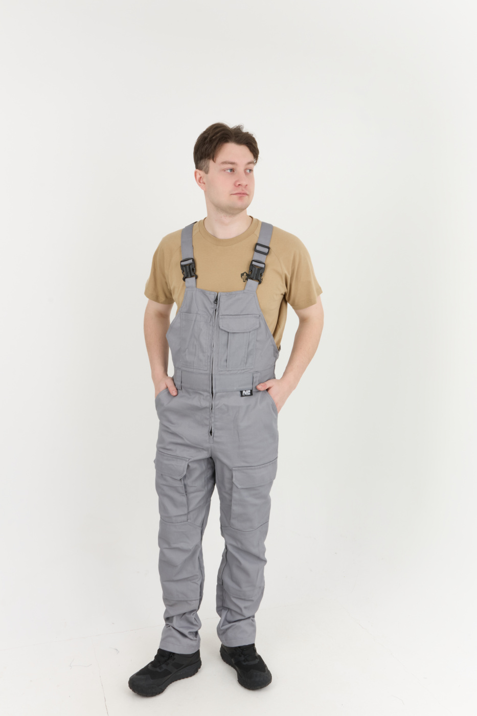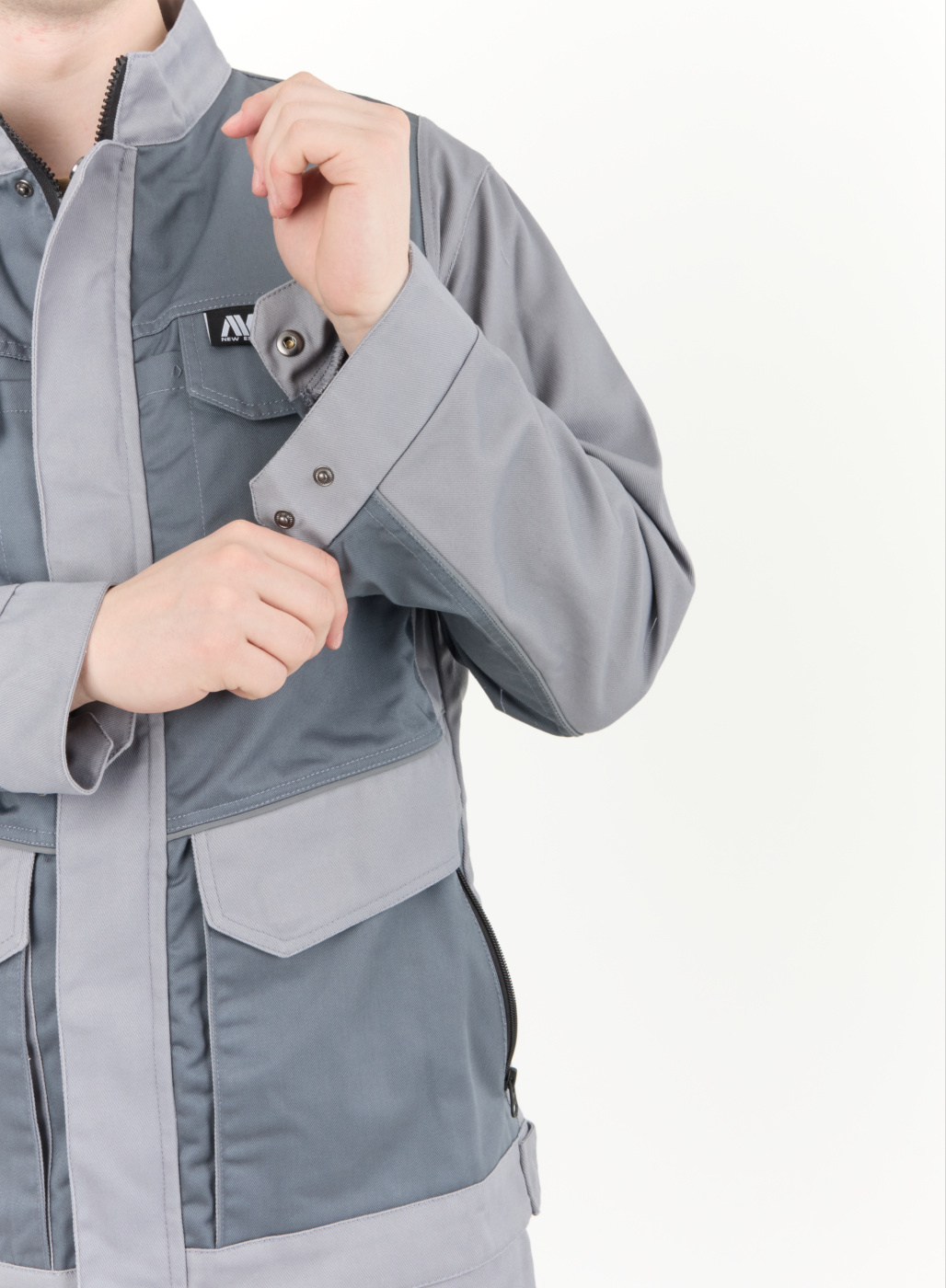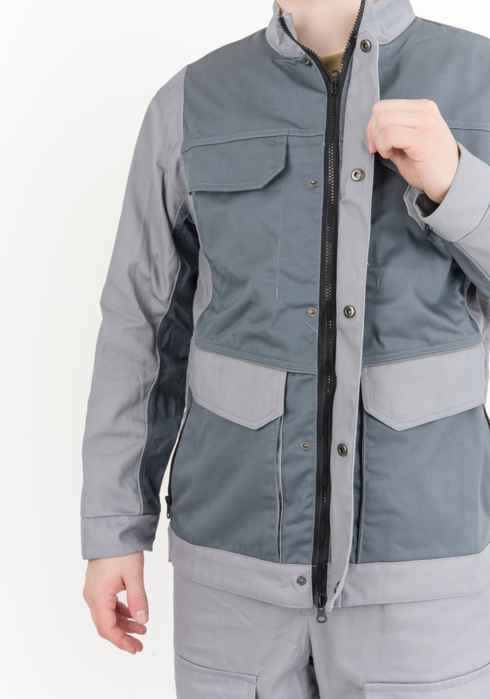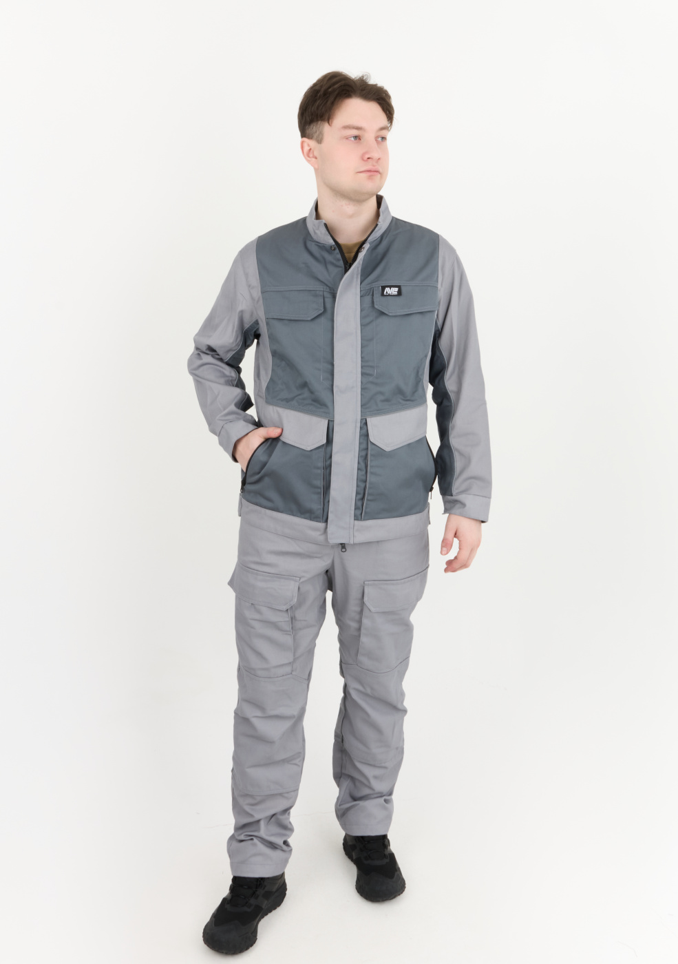 Рабочий комплект выполнен в сером цвете, что позволяет его легко сочетать с другими элементами рабочей одежды
